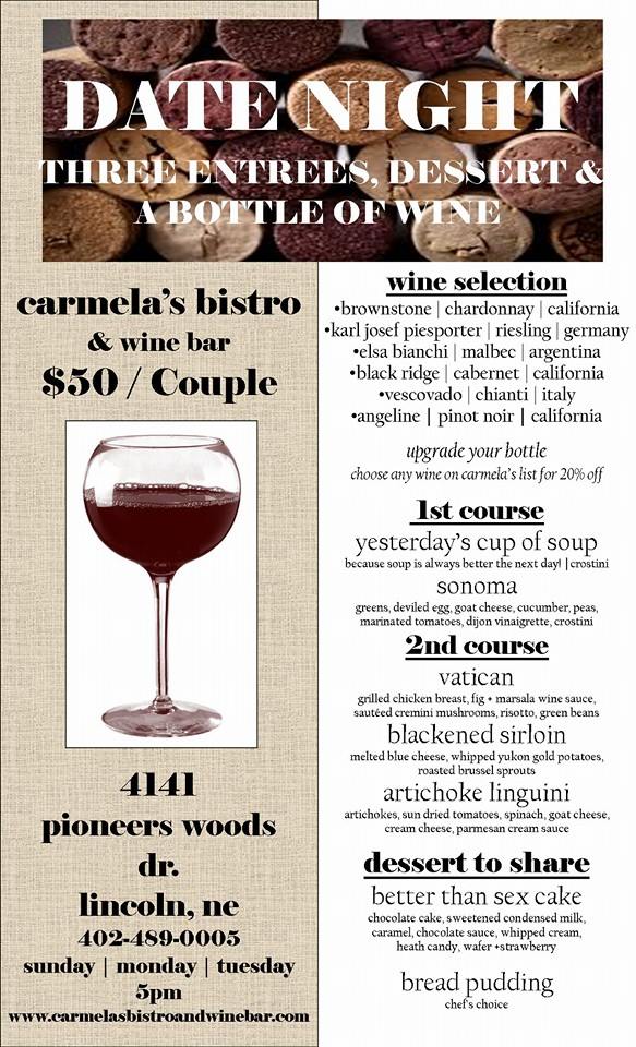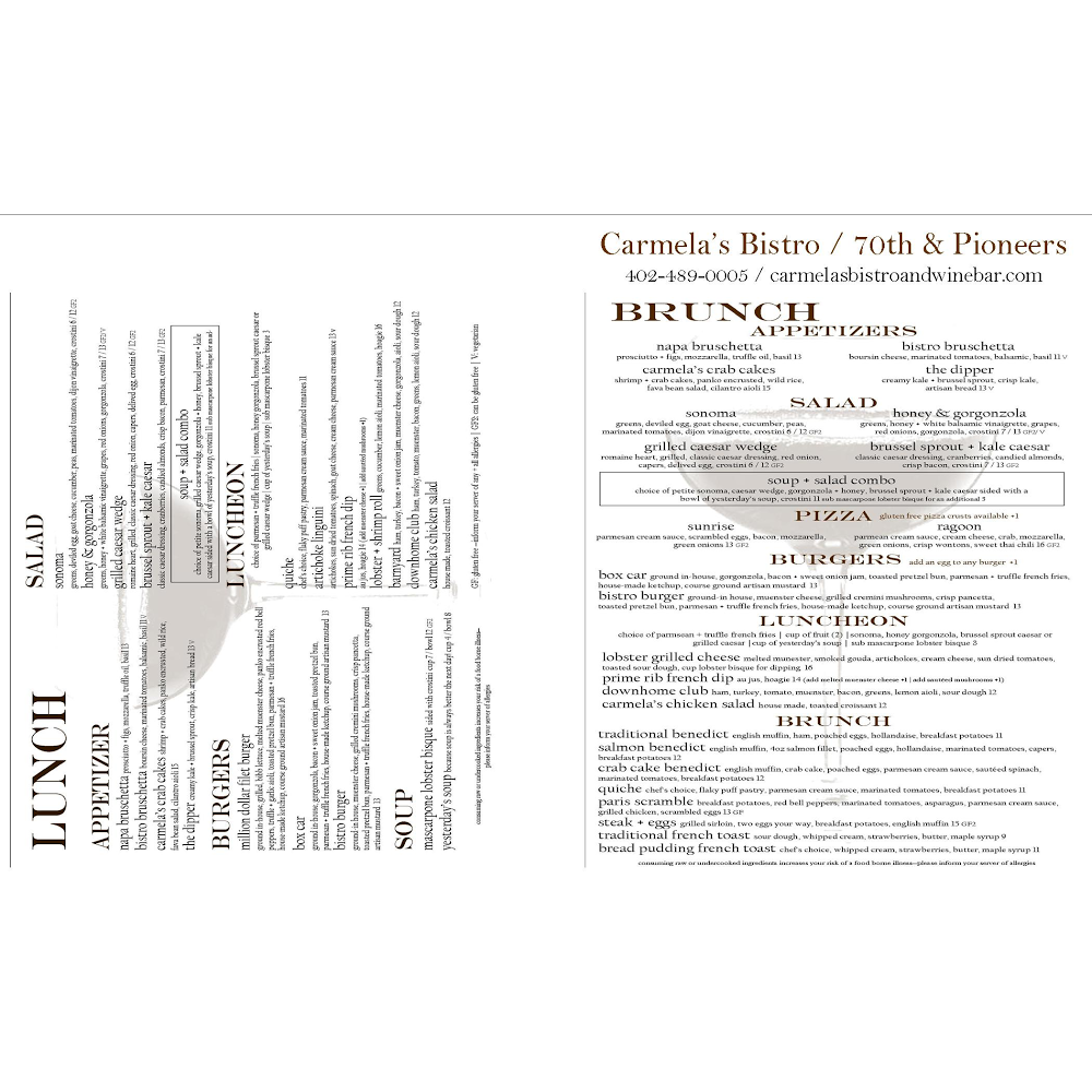 When you step into Carmela's Bistro Menu, you're in for a delightful experience. Nestled at 4141 Pioneer Woods Dr in Lincoln, NE, this cozy bistro brings together a mix of fresh, locally sourced ingredients and timeless recipes. Whether you're in the mood for a savory, hearty dish or something light and refreshing, the menu offers something for every palate. From tender steaks and succulent seafood to mouthwatering pastas, each dish is crafted with care and packed with flavor. And don't forget the daily specials-there’s always something new and exciting to try. It's the perfect spot for a casual meal with friends, a family gathering, or even a special evening out.